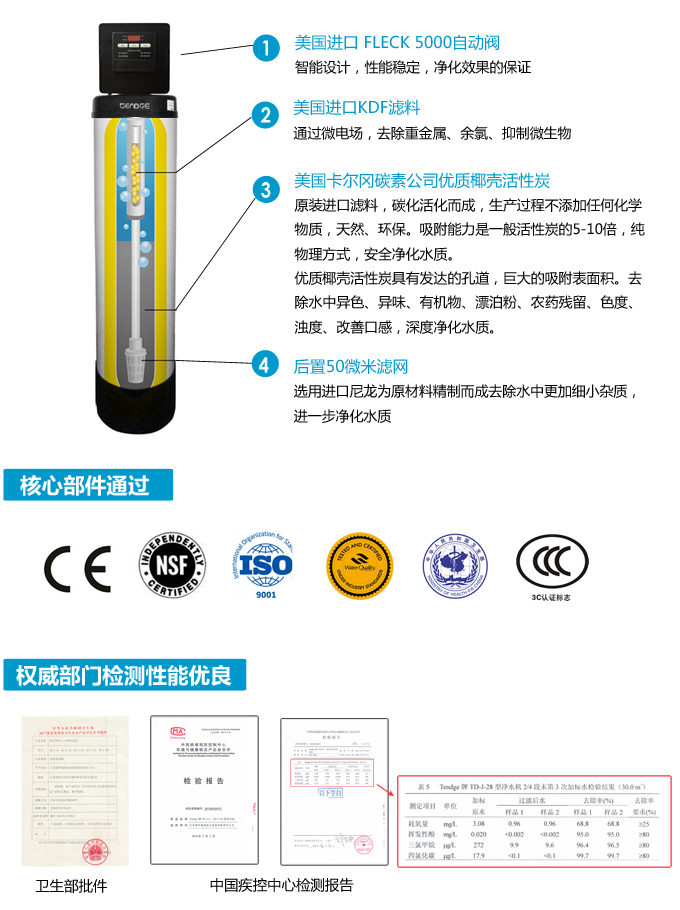 全自動中央凈水機有效去除水中的異色、異味;進一步濾除水中微小雜質、膠狀體;去除水中的漂白粉余氯、農藥、重金屬;保留對人體有益的礦物質。使水變得碧清、碧藍,去除對人體有害的物質。